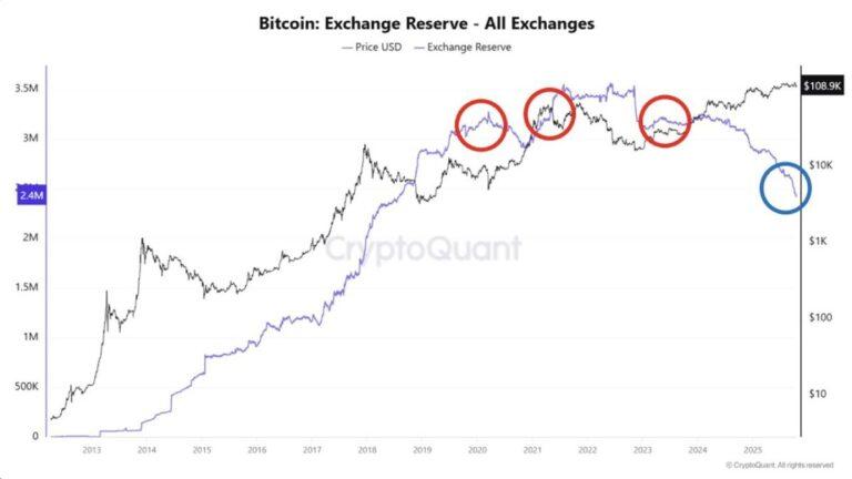 یکی از مهمترین نشانههای فعلی بازار، افت شدید ذخایر بیتکوین در صرافیها است. این روند به معنای کاهش عرضهٔ آمادهٔ فروش و انتقال کوینها به کیفپولهای سرد یا امانیهای شخصی است.