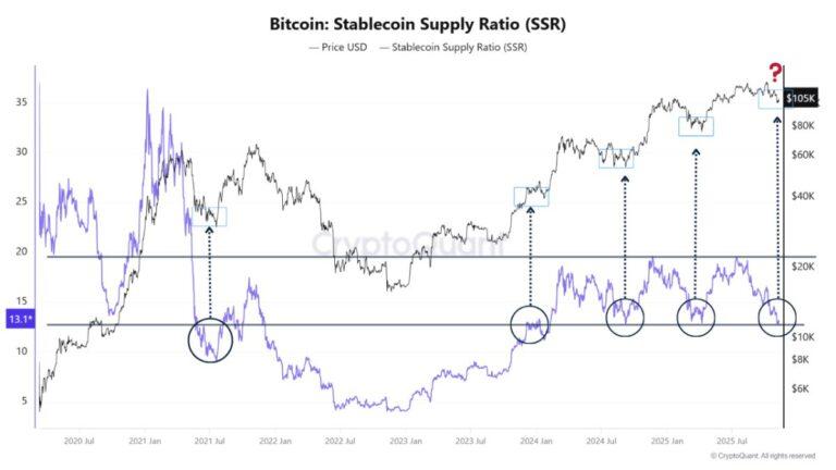 1. Stablecoin Supply Ratio (SSR) نزدیک به کف تاریخی.