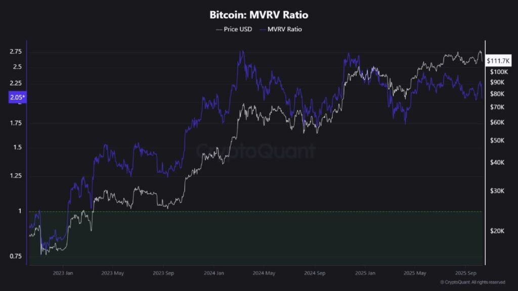 نسبت قیمت فعلی به ۲۰۰WMA حدود ۲ برابر است، در حالی که در پایان چرخه‌های قبلی این نسبت معمولاً به ۳ تا ۴ برابر می‌رسید.