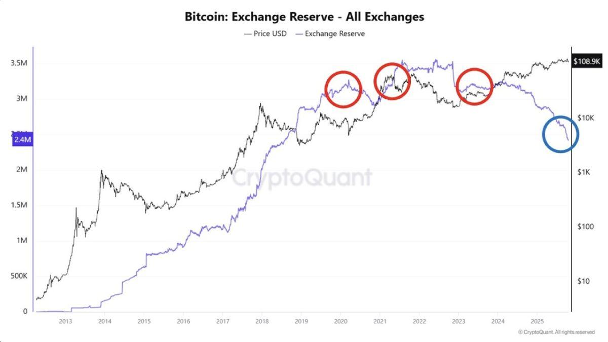یکی از مهمترین نشانههای فعلی بازار، افت شدید ذخایر بیتکوین در صرافیها است. این روند به معنای کاهش عرضهٔ آمادهٔ فروش و انتقال کوینها به کیفپولهای سرد یا امانیهای شخصی است.