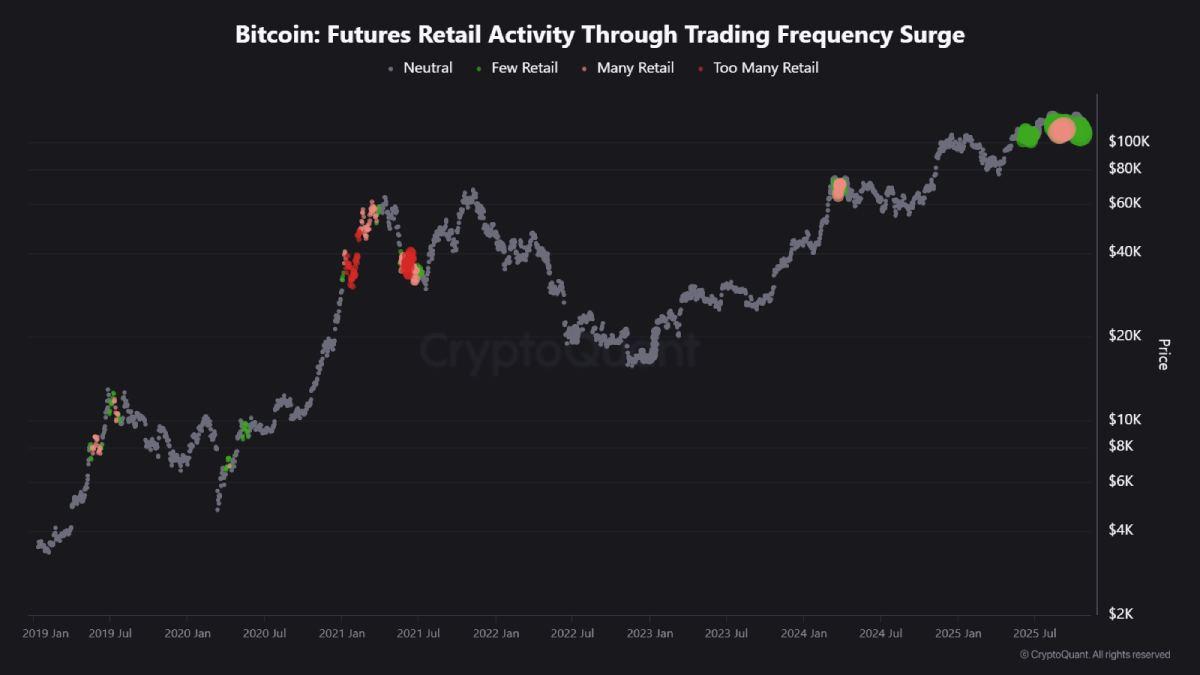 دادههای تازهی CryptoQuant در شاخص Futures Retail Activity Through Trading Frequency تصویری دقیق از رفتار معاملهگران خرد در بازار فیوچرز بیتکوین ارائه میدهد. بر اساس این دادهها، طی هفتههای اخیر فرکانس معاملات خرد به اوج رسیده اما همچنان در بازهی سالم و کنترلشده قرار دارد؛ یعنی بازار در فاز صعودی بالغ است، نه در حباب.