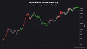 نقشهی Futures Volume Bubble Map نشان میدهد بازار از فاز Overheating در ابتدای ۲۰۲۴ به وضعیت Neutral / Cooling در ۲۰۲۵ رسیده است.