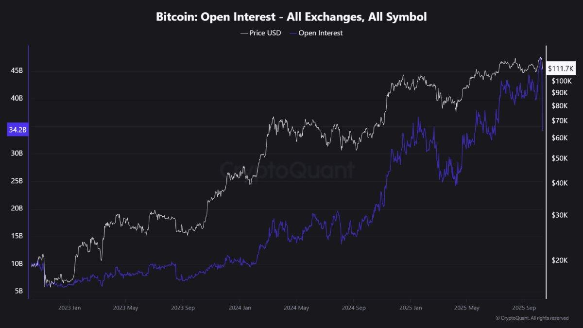 در حالی که قیمت بیتکوین در محدودهی ۱۱۱٬۷۰۰ دلار تثبیت شده، دادههای آنچین و مشتقات نشان میدهند که Open Interest (OI) صرافیها در سطح ۳۴.۲ میلیارد دلار قرار دارد. این عدد نه تنها نشاندهندهی میزان بالای اهرم در بازار است، بلکه رفتار