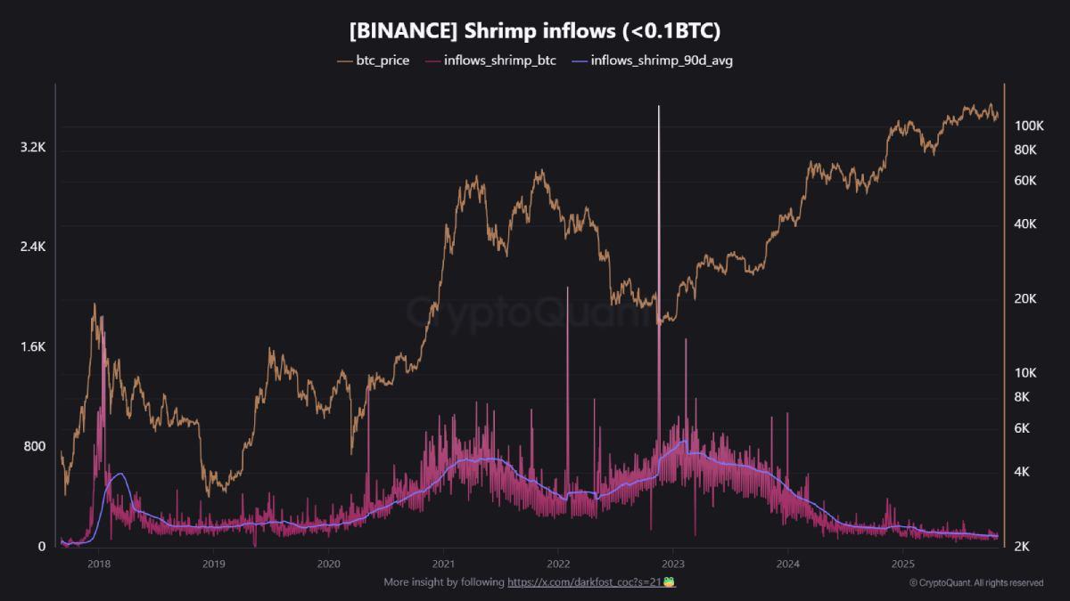 دادههای جدید CryptoQuant تصویری متفاوت از چرخه فعلی بیتکوین ترسیم میکند. طبق این دادهها، ورودی بیتکوینهای خرد (کمتر از ۰.۱ BTC) به صرافی بایننس، پس از راهاندازی ETFهای اسپات، بهشدت کاهش یافته و از حدود ۴۵۰ BTC به حدود ۹۲ BTC رسیده است.